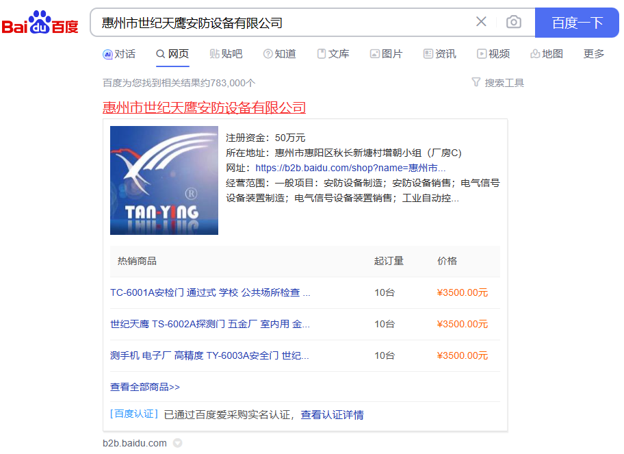 祝贺惠州市世纪天鹰安防设备有限公司入户百度爱采购,公司主营:金属安检门、探测王金属安检门、手持金属探测器、地下金属探测器等,服务由深圳市品汇互联网络科技有限公司提供。¥ 0.00立即购买